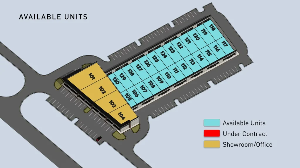 Showroom ve depo alanlarını birleştiren, stratejik konumda modern inşaat projesi.